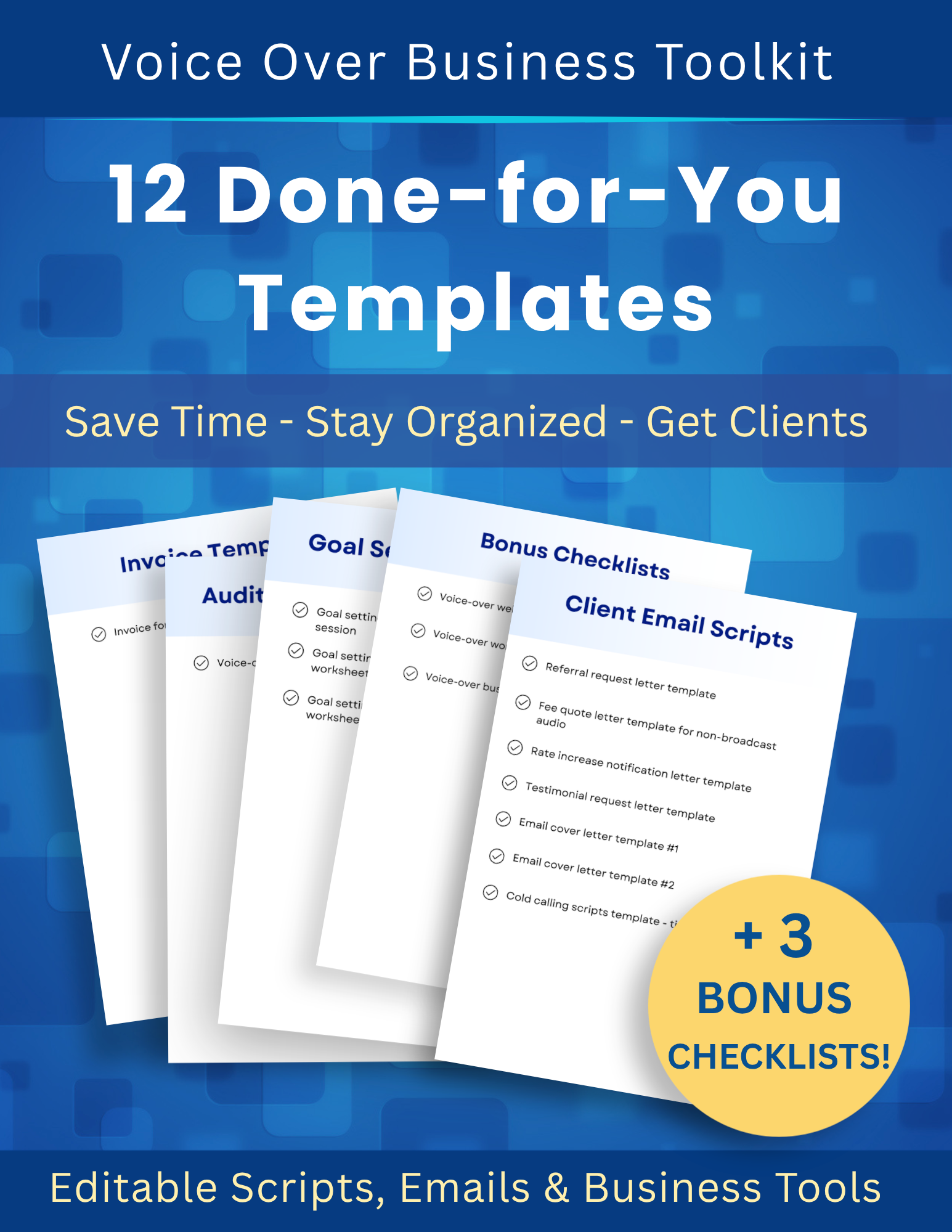 The Voice Over Business Toolkit gives you ready-to-use templates, scripts, and checklists to help you run your business more efficiently—without starting from scratch every time.